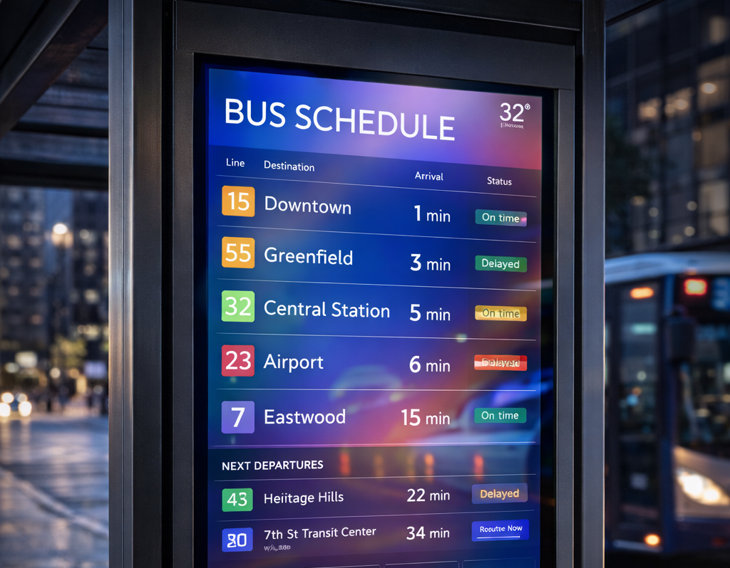The outdoor bus shelter display features a rugged, weatherproof design with an outdoor rated TFT monitor, sunlight-readable backlight, and water resistant touch panel. IK10 strengthened cover glass and extended temperature tolerance ensures reliable, clear visibility and long-lasting performance—keeping passengers informed in any weather conditions.